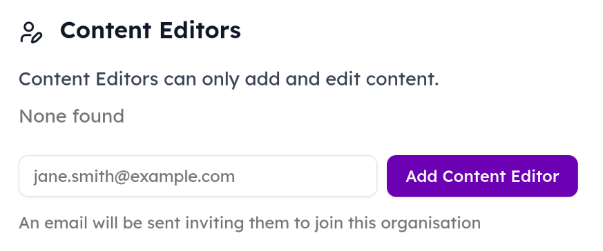 To add a new Content Editor, enter their email address in the box and click Add Content Editor: