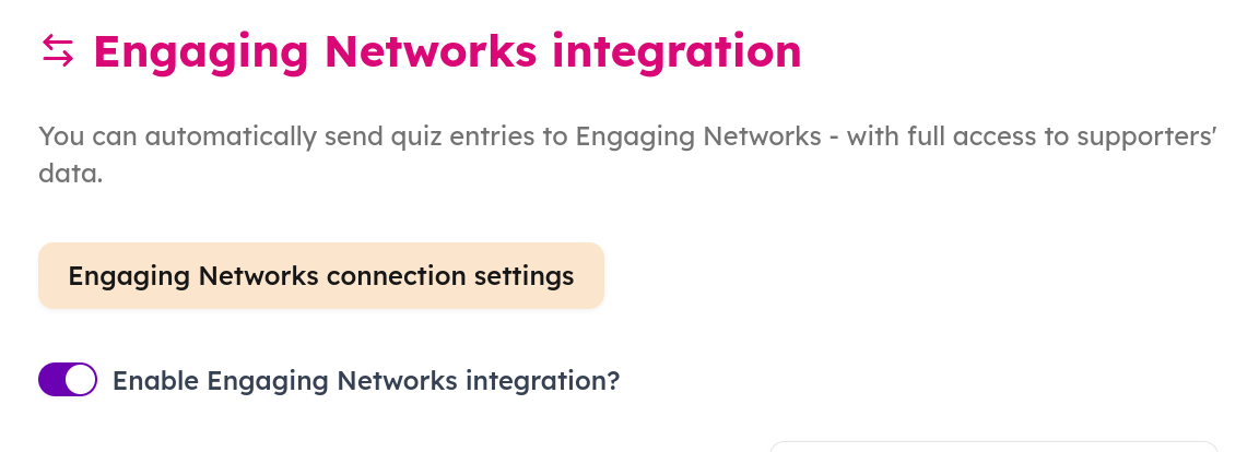 On the results tab of a quiz, toggle on the Enable Engaging Networks integration: