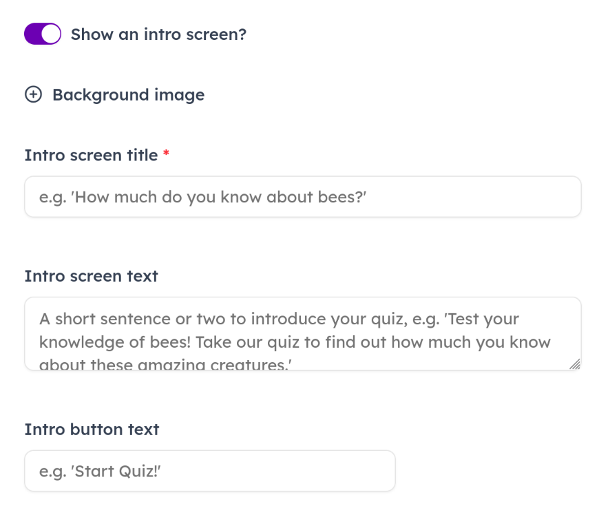 Intro button text: This is the text on the button that users will click to begin the quiz, and move on to the first question.