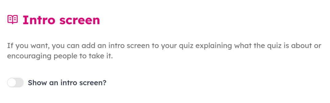 If you toggle on the intro screen, then some additional options and boxes will appear below for you to add content for the intro screen: